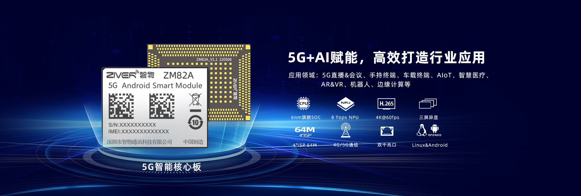 ZM82A(展銳T820)模塊支持 5G NSA和SA 雙模式,向下兼容4G/3G網絡。同時還支持 2.4G&5G雙頻Wi-Fi、藍牙 5.0、多星GNSS(GPS/北斗/GLONASS/Galileo)定位、電源管理、充放電、音視頻編解碼等。提供豐富數據接口,包含 LCM、Touch、多路攝像頭、麥克風、聽筒、揚聲器、DisplayPort、PCIe、UART、USB、I2C、Keypad、GPIOs等接口,可外接多種模塊實現多領域多行業應用。